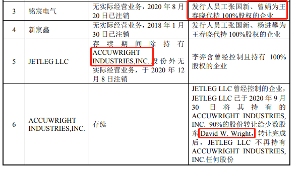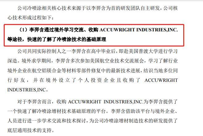 同时招股书显示,境外求学期间,李羿含多次参加美国航空业技术交流展会,学习了解行业 境外企业在航空铝镁合金等材料零部件修复中的最新技术进展,结识当地多位同 行 好 友 , 并 在 境 外 设 立 了 个 人 投 资 企 业 且 收 购 了 ACCUWRIGHT INDUSTRIES,INC。