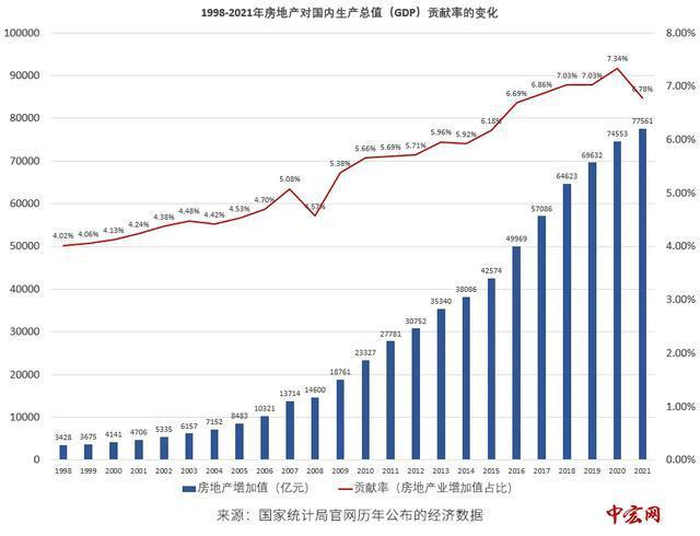 不久前的1月17日,国家统计局发布2021年中国经济的初步核算数据。数据显示房地产对GDP的贡献率由2020年的7.34%回落到6.78%。