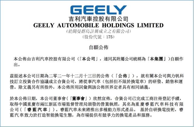 1月24日,吉利汽车宣布旗下出行合资公司——重庆睿蓝汽车科技有限公司,已完成工商注册登记手续,新公司将从事汽车的研发、销售和运营,核心方向就是打造新一代换电车型。