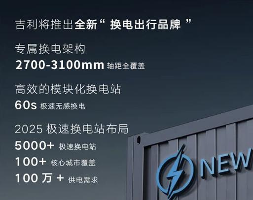 去年11月,吉利提出了新的“智能吉利2025”战略,除了5年内推出超过25款新能源产品等规划以外,也着重强调了换电领域的规划,包括推出全新“换电出行品牌”,以及到2025年,实现100个核心城市布局5000座极速换电站,满足100万辆车的换电需求的目标。