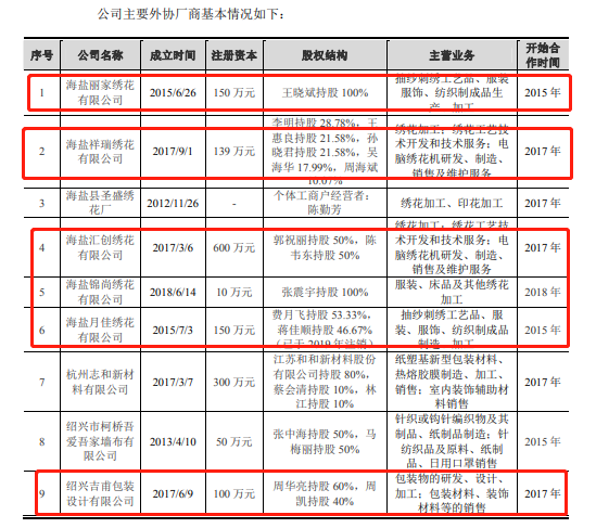 此外,联翔股份的外协厂商海盐汇创绣花有限公司自2017年起即租赁领绣家居位于海盐县东海大道 2887 号领绣家居厂房三楼的场地办公,并且在2018年为公司第一大外协厂商,2019年为公司第四大外协厂商。值得注意的是该公司是在2017年注册的,也就是说该公司一直都是在联翔股份子公司厂房内办公,其真实性和独立性也是值得质疑的。
