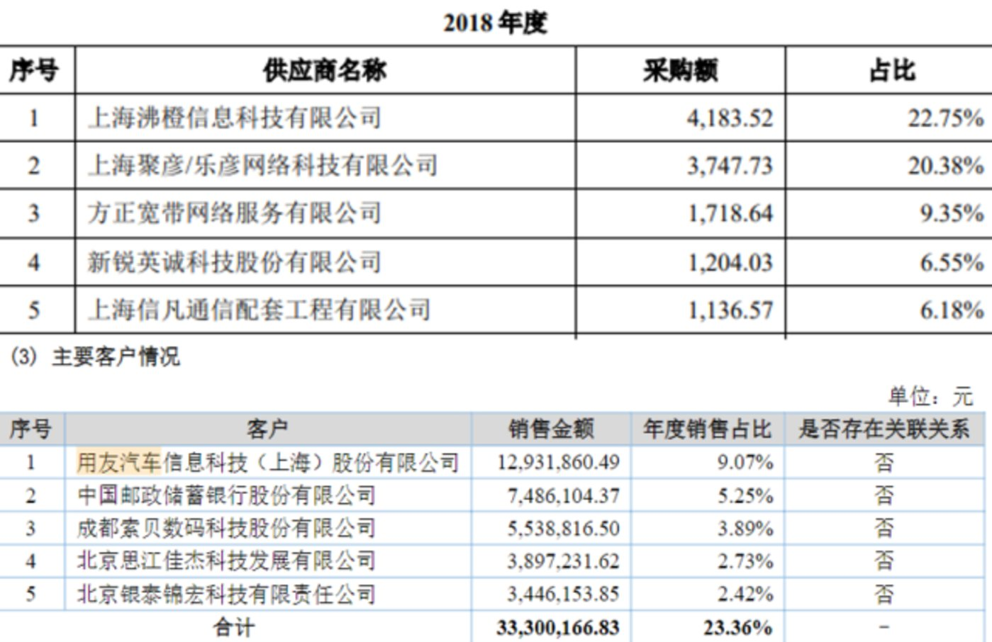 值得一提的是,用友汽车招股书与供应商年报所披露的采购额存在一定差异。招股书中,新锐英诚为用友汽车2018年第四大供应商,对应采购金额为1204.03万元。但在新锐英诚2018年年报中,用友汽车为其2018年第一大客户,对应销售金额为1293.19万元。