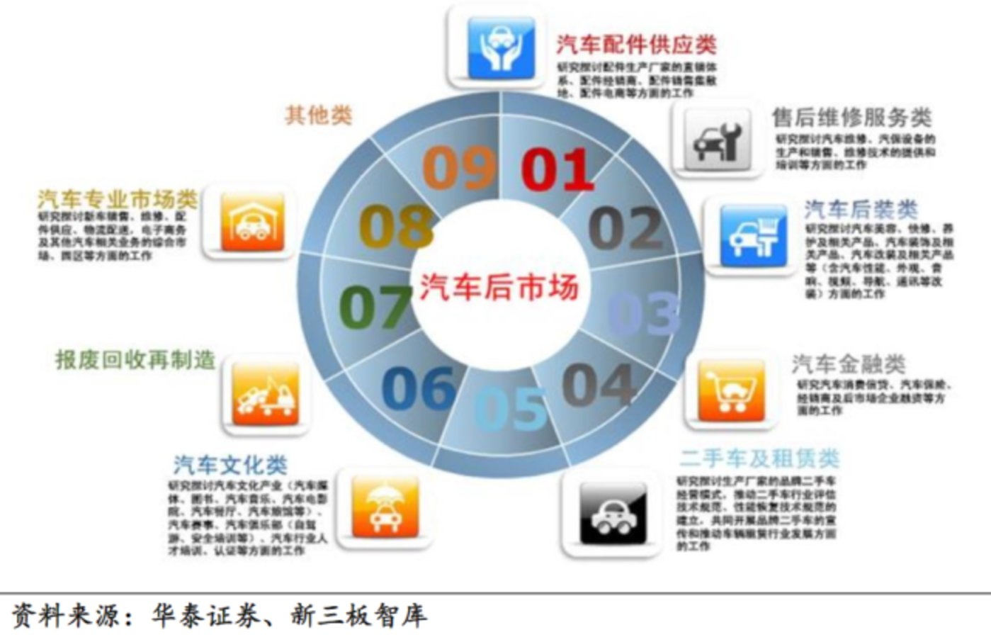 根据中国汽车工业协会,汽车后服务市场分为9类,包括汽车配件供应、售后维修服务、汽车后装、汽车金融、二手车及租赁、汽车文化、汽车报废回收、汽车专业市场及其他。