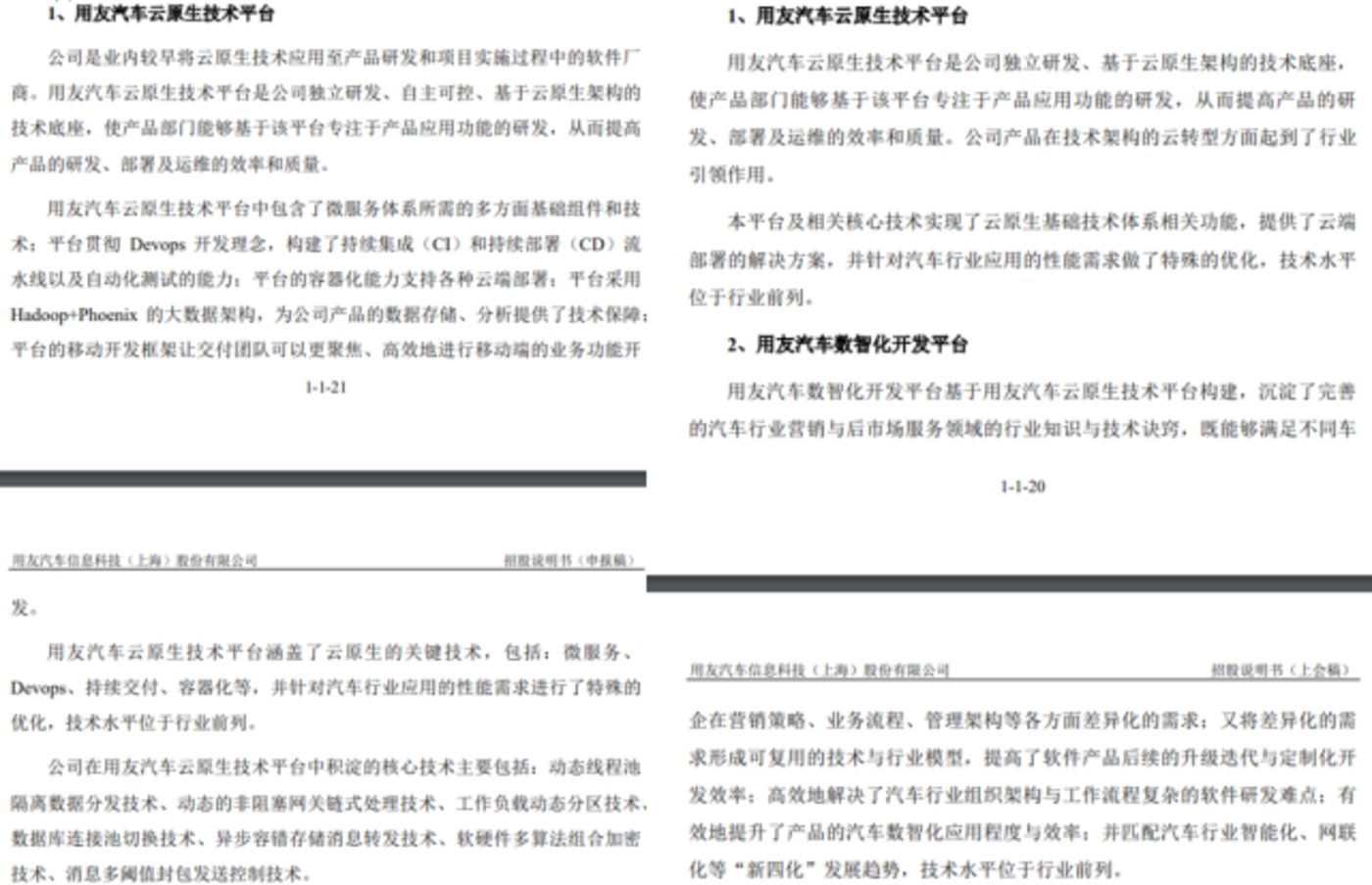 但用友汽车却在回复上交所问询时表示,公司的云原生技术平台并不是开源平台,而是自主研发的、具有独立知识产权和独特核心技术的平台。紧接着,在招股书上会稿中,有关该平台的介绍内容就遭到大幅削减,涉及开源技术的内容也被删除。