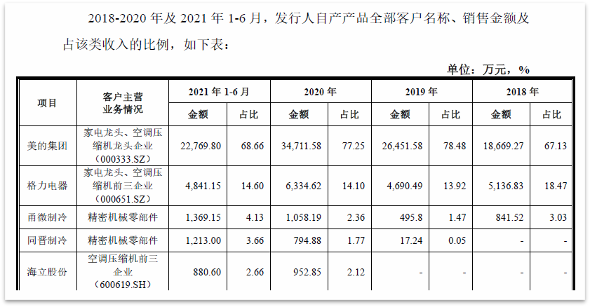 报告期内,联合精密分别实现销售收入27,837.91 万元、34,343.24 万元、45,139.58万元和33,165.73 万元,2018-2020 年年化增长率达27.34%。但是在这收入增长的背后,前五大客户的销售占比达到了97.68%、97.03%、97.15%和93.69%,其中对第一大客户美的集团的销售占比分别为67.06%、77.02%、76.90%和68.65%。