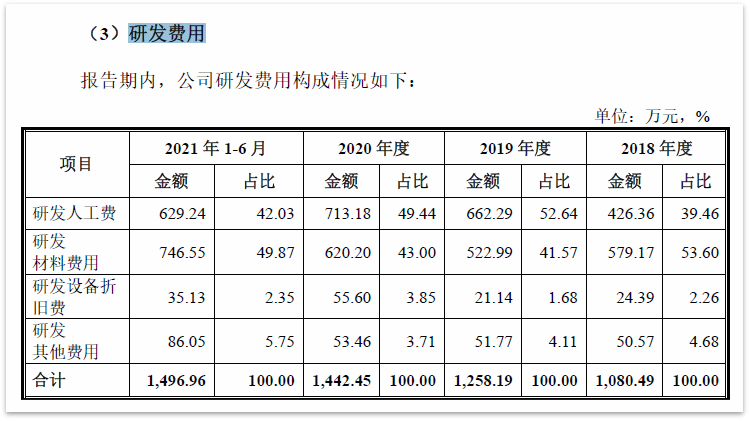 据招股书显示,联合精密在报告期内属于高新技术企业。每年花费大量的研发费用进行着研发。据统计报告期内, 报告期各期,公司研发费用分别为1,080.49 万元、1,258.19 万元、1,442.45万元和1,496.96 万元,占同期营业收入的比例分别3.88%、3.66%、3.20%和4.51%。