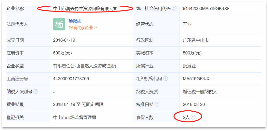 同时中山市润兴再生资源回收有限公司的工商资料,发现该公司虽然收入巨大,但是公司参保人员却只有2个人。