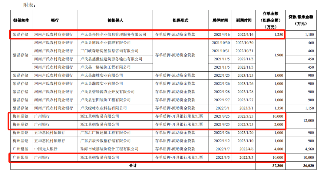 截至2022年3月10日,公司及子公司定期存单违规质押担保余额合计3.73亿元。其中存于广州银行的1亿元存单质押担保的债务已于2022年3月5日到期,相应资金已于2022年3月11日被转至被担保人浙江景朝贸易有限公司银行账户。