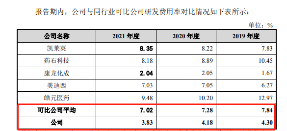 不仅如此,泓博医药在研发费用上占比不足营收的5%,难以想象一家拟上市药企研发费用占比如此少的可怜。2019-2021 年,公司研发费用分别为 1,055.20 万元、 1,183.00 万元和 1,714.44。同期公司研发费用占营业收入的比例分别为4.30%、 4.18%和3.83%,远低于同行业7%左右的平均水平。