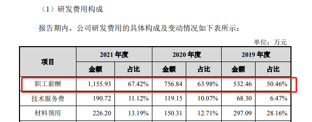 泓博医药在招股书中披露2021年公司研发人员的平均年薪是27.27万,据此测算公司的研发人员薪酬至少应该是1.5亿元,而实际上公司研发费用中的职工薪酬仅1155.93万元。两者相差近10倍,而且若以招股书中披露研发费用中职工薪酬来计算,公司研发人员平均年薪仅2万元。