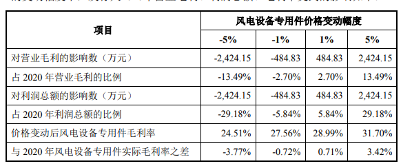 从上述敏感性分析可以看出,风电设备专用件销售价格变动对发行人利润总 额的影响较大。如果风电设备专用件销售价格上升或下降1%、5%,发行人2020 年营业毛利将增加或减少2.70%、13.49%;发行人2020年利润总额将增加或减少 5.84%、29.18%。如果风电设备专用件销售价格上升或下降1%,发行人2020年风 电设备专用件毛利率将提高0.71个百分点或减少0.72个百分点;如果风电设备专 用件销售价格上升或下降5%,发行人2020年风电设备专用件毛利率将提高3.42 个百分点或减少3.77个百分点。