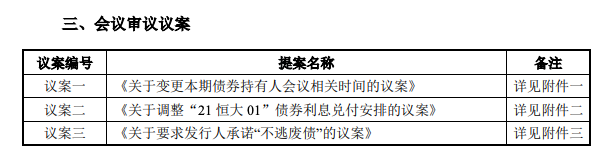 4月21日晚间,恒大地产集团有限公司发布公告:定于2022年4月25日至4月26日召开“21恒大01”持有人会议,审议《关于调整“21恒大01”债券利息兑付安排的议案》《关于要求发行人承诺“不逃废债”的议案》等议案。