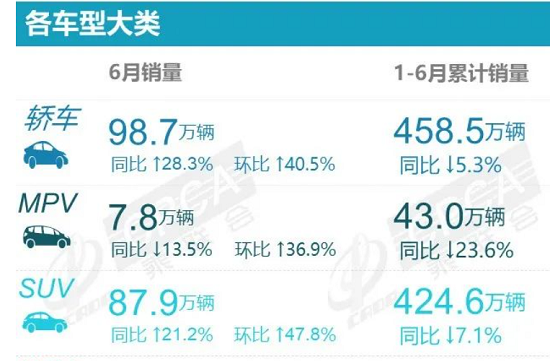 然而,理想虽丰满,现实却很骨感。从乘联会公布的上半年销量数据看,业界期待的MPV市场“大爆发”仍未到来。上半年,我国MPV车型累计销量仅43.0万辆,同比大幅下滑23.6%,在三大车型中降幅居首,而轿车和SUV车型降幅仅为个位数。