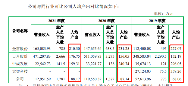 据招股书显示,2019-2021年(下称报告期)飞沃科技主营业务毛利率分别为 34.36%、29.82%和 19.62%,其中2021年公司主营业务毛利下降超过10%。公司表示主要是受原材料上涨所致,然而反观公司上游客户的三一重能,2021年毛利率为37.42%,较2021年增长了7.26%。即便在招股书中披露的同行业公司中,飞沃科技的人均产出也是出于垫底水平。