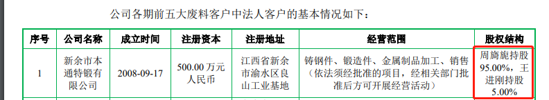 除了与供应商之间不清不楚的外,飞沃科技的废料销售也遭到深交所问询。据问询回复显示,新余市本通特锻有限公司为公司主要废料客户,新余市本通特锻有限公司股权结构为周旖旎持股 95.00%、王进刚持股 5.00%。