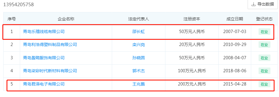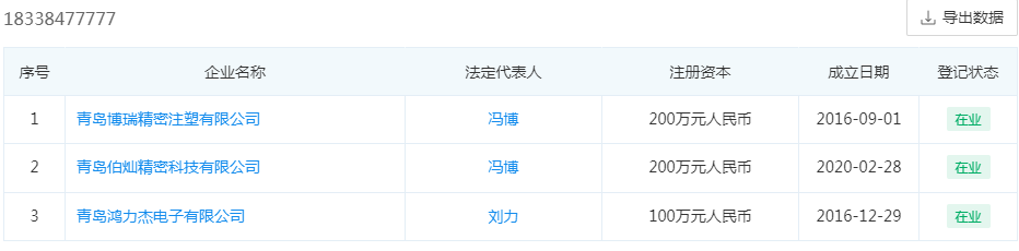 不仅如此,工商信息显示,君泽电子法人为王兆鹏,但是由刘力100%控股。而在两人名下的另一家公司青岛鸿力杰电子有限公司。工商信息显示,该公司同电话企业中包含冯博控制的两家企业,而冯博曾控制的青岛双林精密塑胶有限公司与青岛鸿力杰电子有限公司的曾用名青岛双林电子有限公司商号更是高度相似。