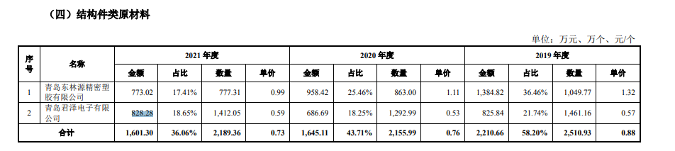 青岛东林源精密塑胶有限公司和青岛君泽电子有限公司是报告期内豪江智能结构件类原材料采购的前两大供货商,报告期内各期二者采购金额合计占当期结 构件类原材料采购金额的比例分别为 58.20%、43.71%和 36.06%。