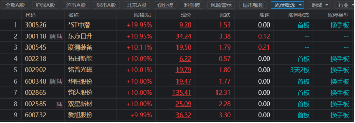 不过,虽然山西路桥的市场热度大幅降温,但其涉及的光伏概念却依然活跃。昨日,光伏、汽车整车、电力设备等前期强势的赛道板块迎来重挫,分析指出,部分赛道板块已经过于拥挤,资金出现分歧。不过,光伏板块今日成功回升走高,个股中,截止今日收盘,拓日新能、铭普光磁、华阳股份、钧达股份、双星新材、爱旭股份涨停,东方日升、联得装备涨幅超10%。