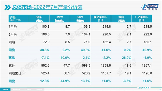 8月9日,乘用车市场信息联席会发布数据,7月,国内乘用车共生产215.8万辆,同比大幅增长41.6%,环比小幅下降2.2%;其中,SUV产量同比增长达49.8%,环比增长2.1%,表现最为突出。1-7月,乘用车产量为1238.6万辆,同比增长11.8%,生产的全面回暖,不仅展示了企业的信心,更对国内车市的结构性逐级增长打下了稳固基础。