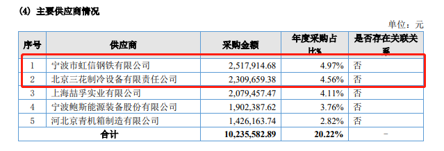 根据新芝生物招股书披露显示,北京三花制冷装备有限责任公司为公司2021年第一大供应商,采购金额278.10万元。而在公司的新三板年报中却显示,2021年北京三花制冷设备有限责任公司为公司第二大供应商,采购金额为230.97万元。