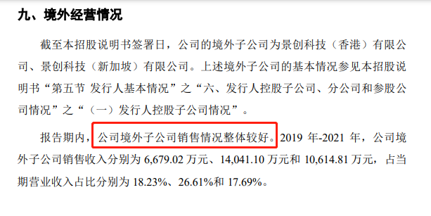此外,小V留意到景创科技招股书中关于境外经营情况描述也比较有意思。景创科技认为报告期内公司境外子公司销售情况整体较好,甚至贴出了境外子公司的销售情况。2019 年-2021 年,公司境外子公司销售收入分别为 6,679.02 万元、14,041.10 万元和 10,614.81 万元,占当期营业收入占比分别为 18.23%、26.61%和 17.69%。