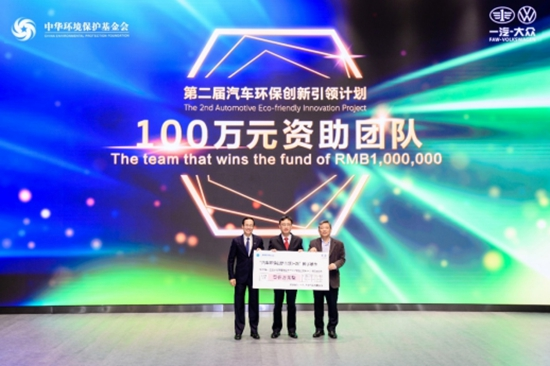 一汽-大众董事、党委书记、总经理潘占福与中华环境保护基金会理事长徐光为获得100万元资助团队代表颁发种子基金 企业供图