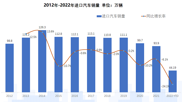 根据中国汽车流通协会数据,2015-2019年,我国进口车销量始终维持在110万辆左右的规模,从2020年开始呈现下滑,2020年销量跌破百万辆大关,为99.7万辆,同比下降10.2%;2021年为93.9万辆,同比再下降6.1%。