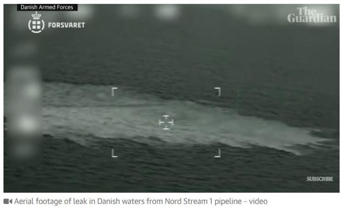英国《卫报》称,丹麦通过军事飞行拍下了泄漏处的现场图像,其中一张显示海面上出现了一片类似气体冒泡区域。