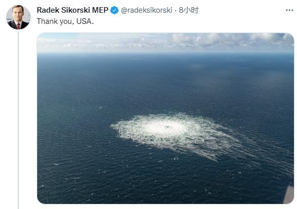波兰前外长西科尔斯基的态度则十分微妙。他在社交媒体上仅发了一张“北溪”管道所在水域发生水下爆炸后的海面图,并配文称“谢谢你,美国。”