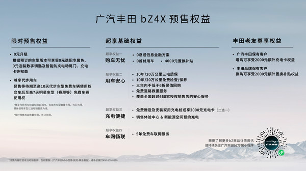 与此同时,广汽丰田bZ4X还为车主提供了一系列的售后保障及丰富的购车权益,旨在为顾客提供多样化的购车选择、以及更安心的用车体验。在遍布全国的超660家广汽丰田经销店,bZ4X都可以获得10年或20万公里三电质保、10年或20万公里免费检查/保养、三年内不低于6折保值回购、免费赠送及安装家用充电桩或享2000元充电卡(二选一)、以及5年免费车联网服务等等众多超享权益。