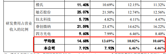 研发投入方面,歌尔微也不及同行业公司。告期内, 公司研发费用分别为 11,452.26 万元、20,403.67 万元、26,511.33 万元和 11,582.81 万元,占营业收入的比例分别为 4.46%、6.46%、7.92%和 7.92%,各期均远低于同行业公司均值。