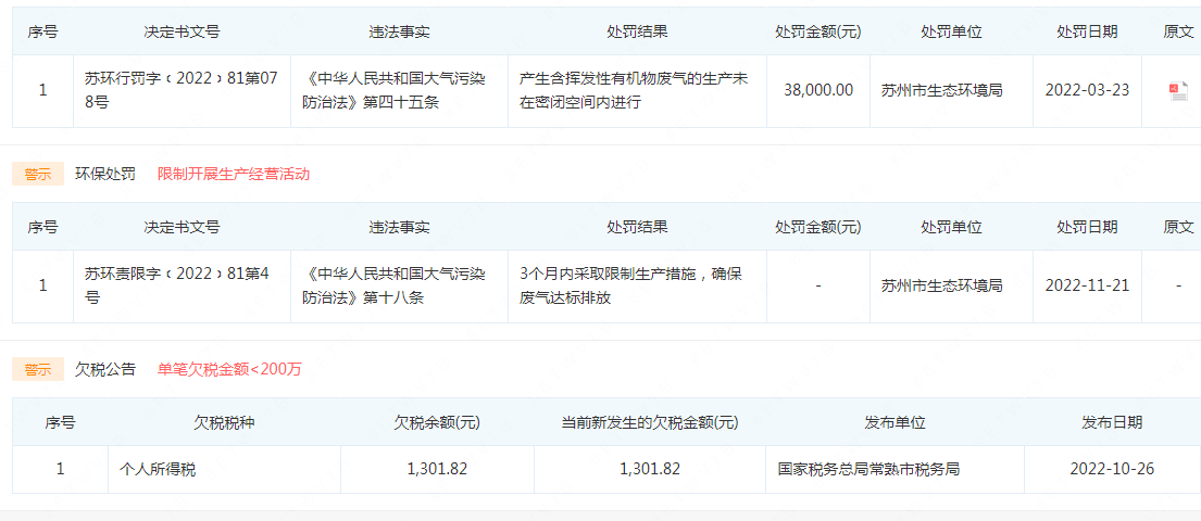 康鹏科技客户常熟市长江胶带有限公司在2020同样因产生含挥发性有机物废气的生产,未在密闭空间或设备中进行被苏州市生态环境局罚款2万元。2022年1月9日因常熟市长江胶带有限公司存放危险化学品的仓库内储存压敏胶(危险化学品目录序号:2828)数量不符合国家标准被常熟市应急管理局罚款53750元。2022年11月又因产生含挥发性有机物废气的生产未在密闭空间内进行,未按照国家环境保护标准要求贮存危险废物被苏州市生态环境局罚款17.7万元。