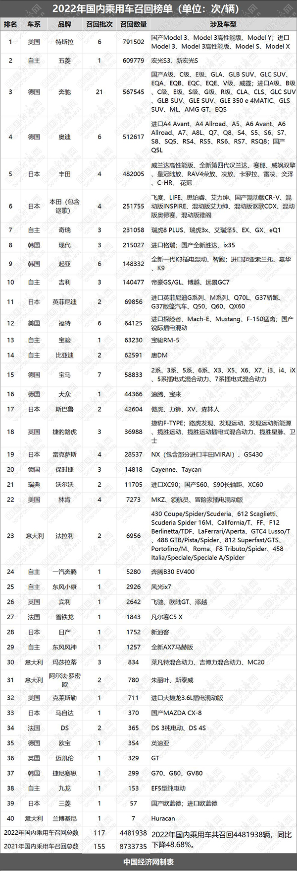 2022年,韩系现代、起亚、捷尼赛思3品牌累计召回乘用车363658辆,占召回总量的8.11%。而来自英国、瑞典、意大利和法国的品牌,召回占比均不足1%。(中国经济网记者 郭跃)