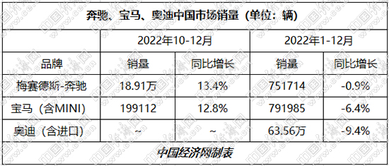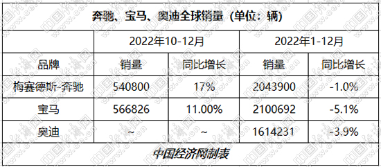 作为高档车品牌领头羊,BBA受到的冲击首当其冲。数据显示,2022年宝马和奔驰分别销售79.2万辆、75.17万辆,同比分别下降6.4%、0.9%。另据一汽-大众发布的数据,奥迪全年累计销售63.56万辆,同比下降9.4%。