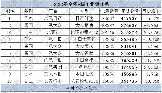 值得关注的是,在A级车销量排名前十的车型中,燃油车依旧被熟悉的面孔占据,但颓势已经开始显现,包括轩逸、卡罗拉,以及雷凌等降幅均在两位数以上;反观新能源车型,比亚迪秦PLUS全年突破30万辆,增幅超过八成,排名也从一年前勉强进入榜单,到如今稳居季军之位。