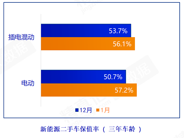 值得一提的是,近年来电动汽车保值率始终稳步提高。今年1月,三年车龄电动汽车保值率已达到57.2%,环比提升6.5个百分点,其保值率甚至超过了插电混动车型。