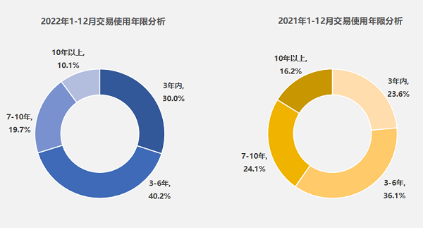 在车龄方面,随着促消费政策效果的显现,2022年低龄二手车愈加受到追捧。数据显示,2022年我国二手车使用年限在3-6年的交易量最多,占比为40.2%,同比增长4.1%;使用年限在3年内车型占比30.0%,同比增长6.4%,而其余年限二手车占比均有所下滑。