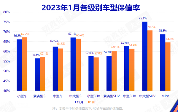 这一特点在最新的保值率报告中一览无遗。今年1月,小型车、紧凑型车以及紧凑型SUV保值率均实现增长,其余车型保值率则纷纷下滑,其中中大型SUV价格降幅最大。