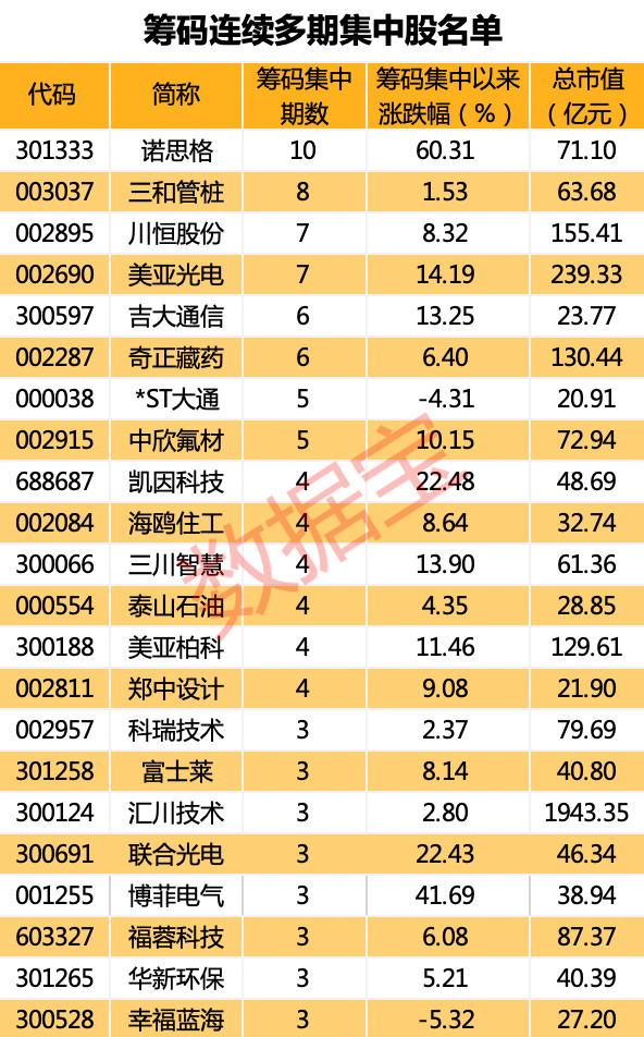 数据宝统计,与之前各期的股东数据相比,22股的股东户数连续减少3期以上,股东户数最多的已连降10期,筹码呈持续集中趋势。