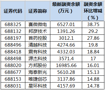 统计显示,2月27日共有277只科创板个股融资余额环比增加。其中,18股融资余额增幅超过10%。融资余额增幅最大的是赛微微电,最新融资余额为6527.01万元,环比增幅达38.75%;融资余额增幅较大的还有邦彦技术、首药控股、清越科技、震有科技、源杰科技等股。