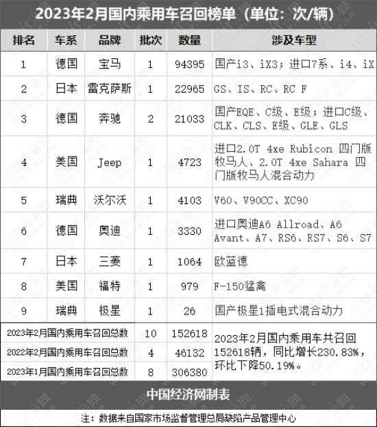 据国家市场监督管理总局缺陷产品管理中心数据,2月,国内共有9家品牌累计发布10起公告,共召回乘用车152618辆,同比增长230.83%,环比下降50.19%,依旧延续低位运行。