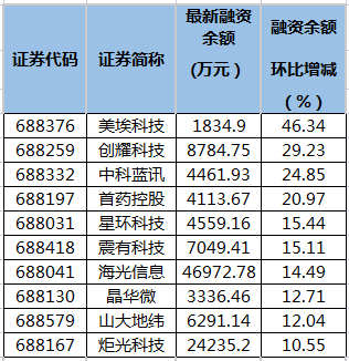 统计显示,3月3日共有231只科创板个股融资余额环比增加。其中,10股融资余额增幅超过10%。融资余额增幅最大的是美埃科技,最新融资余额为1834.9万元,环比增幅达46.34%;融资余额增幅较大的还有创耀科技、中科蓝讯、首药控股、星环科技、震有科技等股。