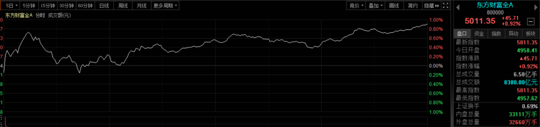 A股市场也沸腾了。沪指午后涨超1%,深成指涨0.34%,创业板指跌0.65%,贵金属、国资云、信创、中字头等板块领涨,中国移动触及涨停,中国电信、中国石油、中国石化等权重蓝筹纷纷走强。数字经济概念股掀涨停潮,国资云方向领涨,万兴科技、立昂技术、久远银海、用友网络、科安达、特发信息、数据港等近10股集体封板,数字认证、新国都、中孚信息、中望软件等多股涨超10%。截至收盘,沪指大涨超1%,全A指数大涨近1%。