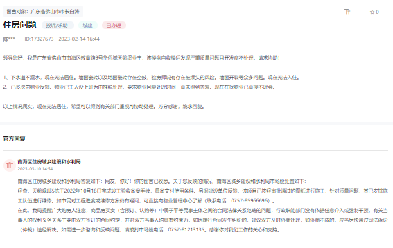 据该网友描述,该房屋存在下水道不排水、墙面瓷砖以及地面瓷砖空鼓、墙面开裂等众多问题,现在无法居住。其多次向物业反馈,物业以“工人没上班”为由推脱,要求回复处理时间一直未得到答复。