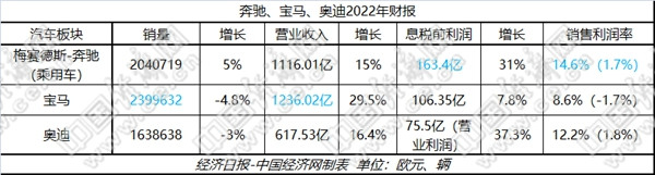 对比BBA汽车板块主要财务指标,宝马2022年继续在销量、营收上实现引领,奔驰则在息税前利润、销售利润率上保持大幅领先。奥迪在销量、营收、息税前利润上,虽然与两位“德国老乡”有不小差距,但其销售利润率却表现不俗,超过宝马,与奔驰也仅相差2.4个百分点。
