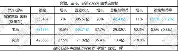 对于2023年的业务发展,齐普策持乐观态势,并认为将继续受益于市场对其电动车及高端车型的强劲需求。奔驰方面则预计其乘用车总销量将保持上年水平,高端豪华车型将略高于上年水平,调整后销售利润率将达12%至14%,净定价略有上升。奥迪预计全年将交付180万至190万辆汽车,销售收入将创造690亿至720亿欧元的新纪录,经营销售利润率将在9%至11%之间,净现金流将在45亿至55亿欧元之间。(中国经济网记者 郭涛)