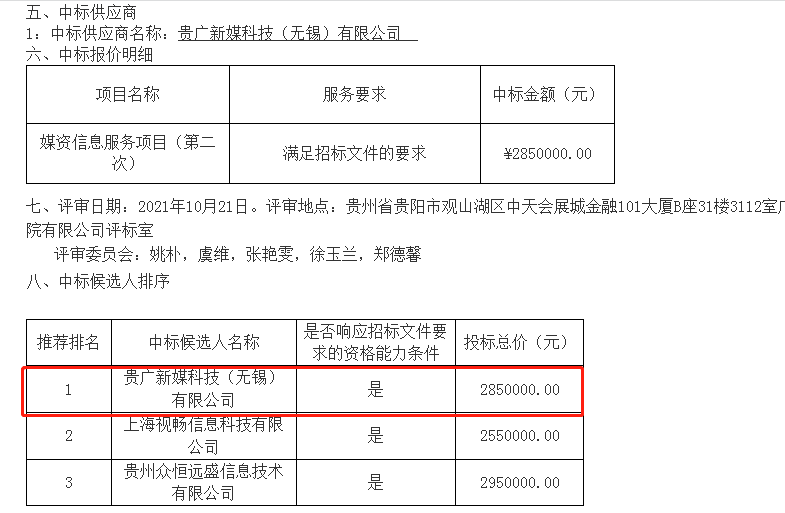 而且,《V财网》还发现多彩新媒子公司贵广新媒科技(无锡)有限公司竟然出现在公司《媒资信息服务项目》的中标候选人中,根据中标公告显示,贵广无锡以285.0万元的价格中标。作为并表子公司参加控股母公司竞标,而且是以中位价格中标,这其中的合规性值得质疑。