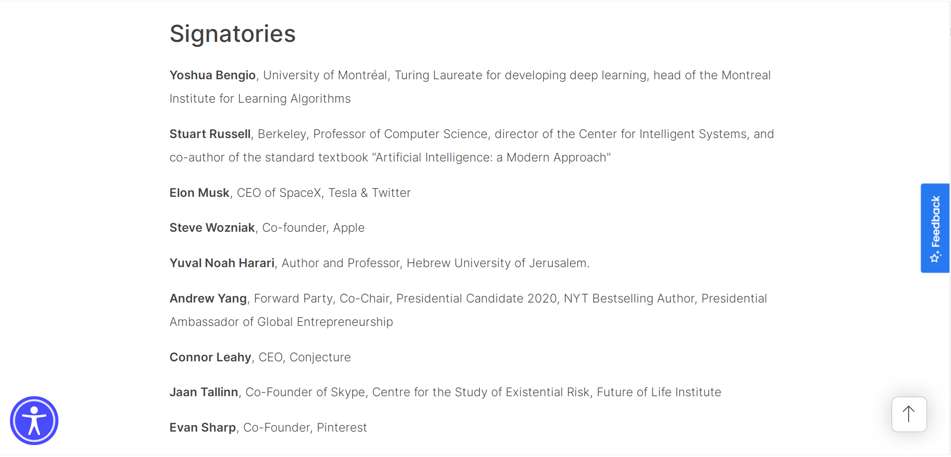 截至发稿,这封信已有1127名科技领袖和研究人员签名,除了马斯克、辛顿和马库斯之外,还包括图灵奖得主约书亚·本希奥(Yoshua Bengio)、《人工智能:现代方法》作者斯图尔特·罗素(Stuart Russell)、苹果公司联合创始人史蒂夫·沃兹尼亚克(Steve Wozniak)、Stability AI首席执行官埃马德·莫斯塔克(Emad Mostaque)等科技界领袖人物。