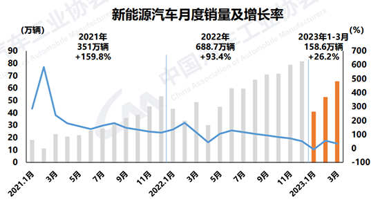 相比车市整体,新能源汽车依旧保持快速增长趋势。数据显示,3月新能源汽车产销分别完成67.4万辆和65.3万辆,同比分别增长44.8%和34.8%,市占率为26.6%;一季度,产销分别完成165万辆和158.6万辆,同比分别增长27.7%和 26.2%,市占率达到26.1%。