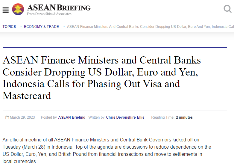 《东盟简报》网站报道,东盟财长和央行行长会议近期在印度尼西亚举行。会议的首要议程是讨论如何减少金融交易对美元等货币的依赖,转向以当地货币结算。